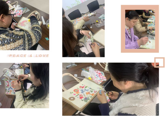 蝶古巴特(Decoupage)是一门源自欧洲的古老拼贴艺术,寓意“将美好剪裁,让平凡焕新”。活动伊始,工作人员以“蝶变”为引,讲述这项艺术的起源与文化内涵,并巧妙关联女性成长——如破茧成蝶般,经历沉淀与突破,终将绽放独特光芒。参与者们手持素色麻布包、缤纷印花纸巾、专用胶水与工具,在工作人员的启发下,从构图、剪裁到粘贴、封层,一步步将零散图案拼贴成独一无二的艺术作品。